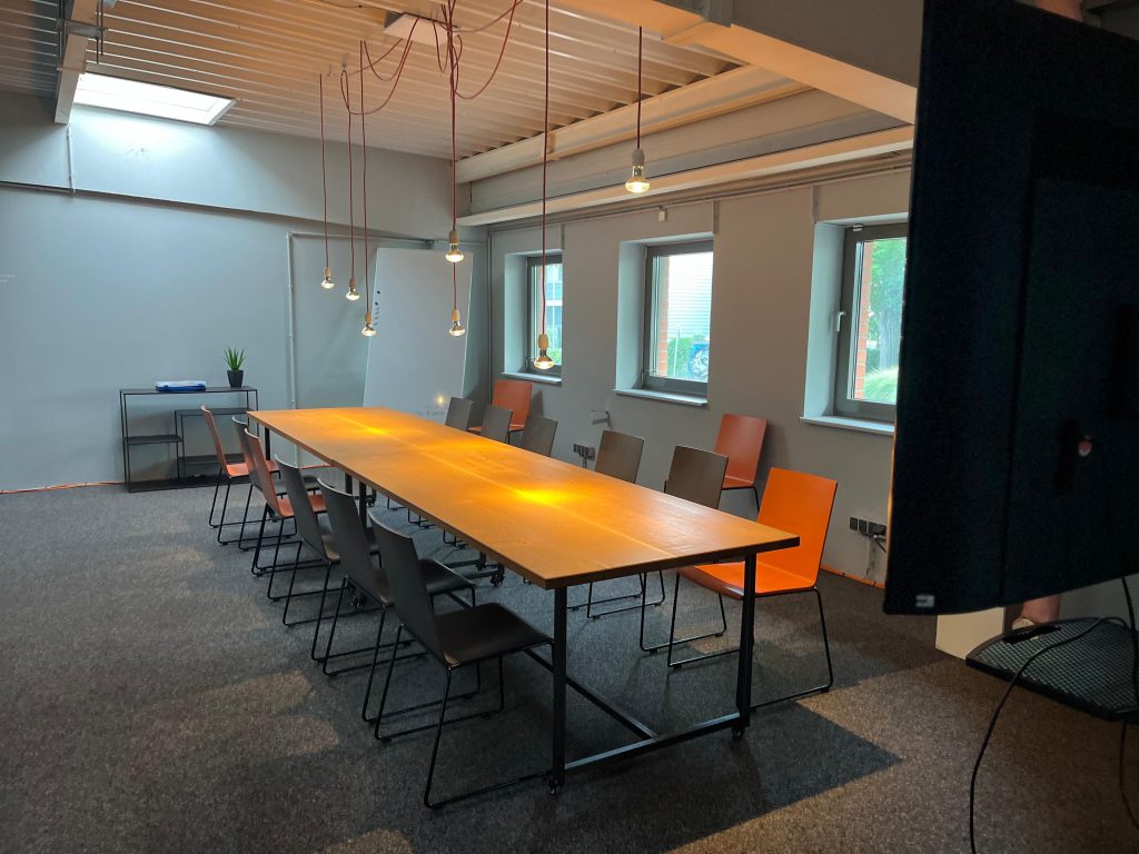 - Großer Tisch mit 10 Stühlen, Sofaecke für ca. 6 Personen, Whiteboard und Moderationskoffer. Auf Wunsch mit großem Bildschirm (HDMI).